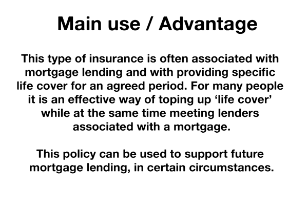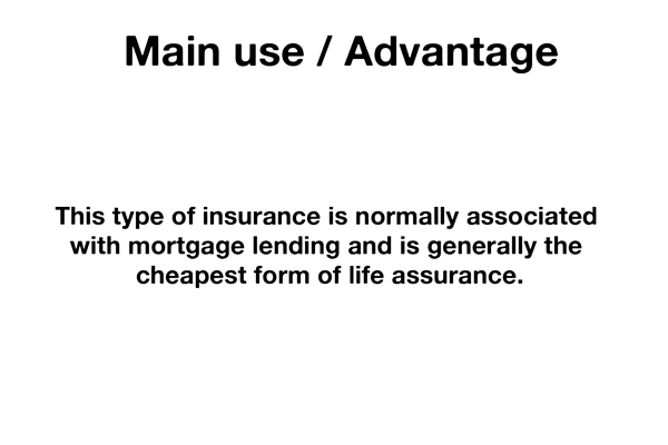 You select an initial sum to be insured over an agreed term for a fixed monthly/annual premium. The sum insured decreases each year until the end of the term, at which time all insurance cover ceases. There are no savings associated with this product.