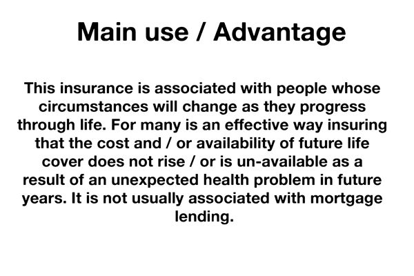 You select an initial sum to be insured over an agreed term for a monthly/annual premium. The sum insured and type of policy is convertible within parameters set out in the policy by the assurance company. However, you can amend the term and cover provided on the basis of your health status as defined by the assurance company at the time the policy was taken out. The premium you pay will be adjusted in line with the changes in your policy, based on your original health status. There are no savings associated with this product.